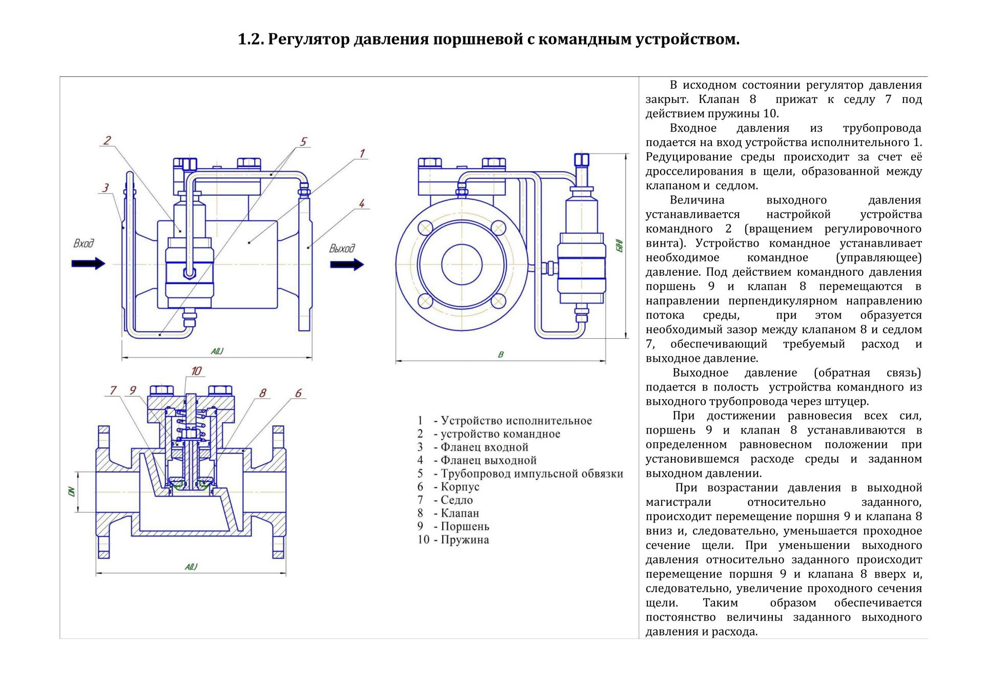 Работа регулятора осуществляется за счет энергии рабочей среды. Настройка регулятора на заданное давление осуществляется вращением регулировочного винта пилота. Управляющее давление от пилота поступает в полости поршневой камеры исполнительного устройства. Разница давлений на поршне исполнительного устройства создает аксиальное усилие. Любое изменение контролируемого параметра (входного, выходного давления или перепада давления) вызывает перемещение подвижной системы в новое равновесное состояние. При нулевом расходе рабочей среды затворы пилота и исполнительного устройства герметично закрываются